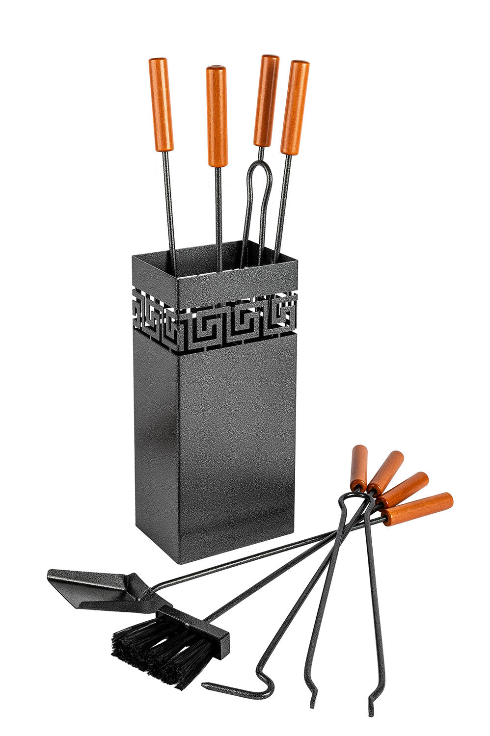 Trespolo per Attrezzi Camino Rettangolare Sagoma Greca con Paletta Scopino Attizzino e Pinza 17,5x12,5x62 cm in Ferro Verniciato Grigio Martellato