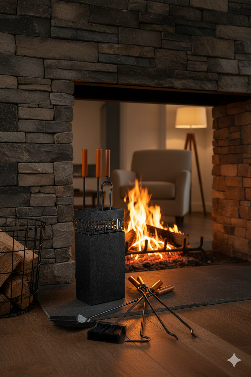 Trespolo per Attrezzi Camino Rettangolare Sagoma Greca con Paletta Scopino Attizzino e Pinza 17,5x12,5x62 cm in Ferro Verniciato Grigio Martellato - La Ferrotecnica