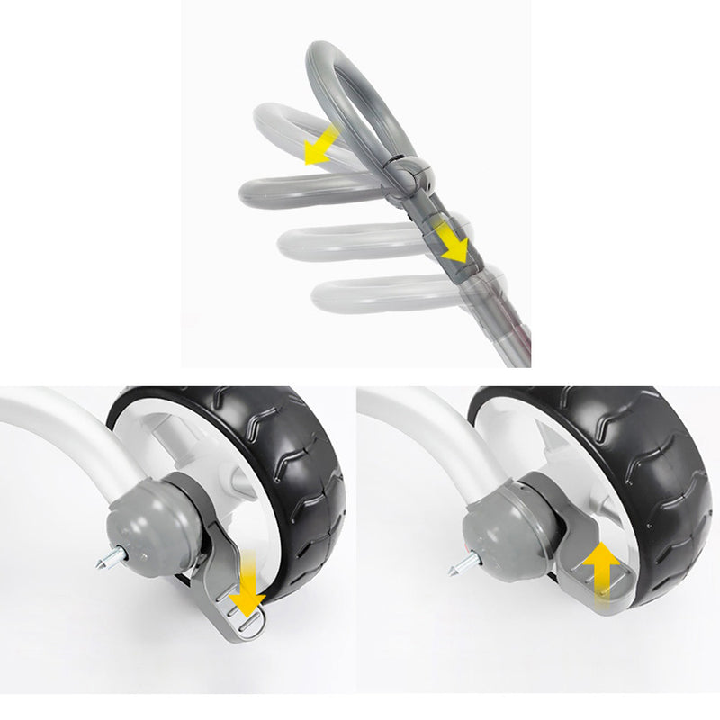 Roues plus hautes et profilées en ABS avec alliages d'aluminium et recouvertes de caoutchouc souple et résistant, super silencieuses pour donner une adhérence maximale au sol et peuvent également être utilisées sur des surfaces moins parfaites. Roue avant équipée d'un système de roue libre pour éviter de coincer les pieds de l'enfant lors de la poussée du tricycle, double frein sur les roues arrière.