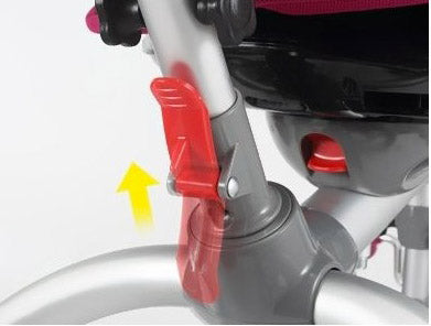 Roues plus hautes et profilées en ABS avec alliages d'aluminium et recouvertes de caoutchouc souple et résistant, super silencieuses pour donner une adhérence maximale au sol et peuvent également être utilisées sur des surfaces moins parfaites. Roue avant équipée d'un système de roue libre pour éviter de coincer les pieds de l'enfant lors de la poussée du tricycle, double frein sur les roues arrière.