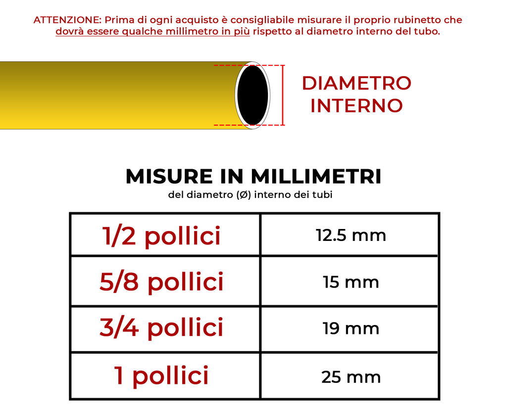ATTENZIONE: Prima di ogni acquisto è consigliabile misurare il proprio rubinetto che dovrà essere qualche millimetro in più rispetto al diametro interno del tubo.