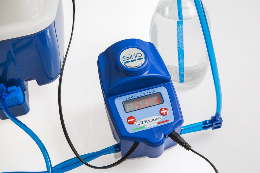 SIRIO est constitué d'une pompe péristaltique double conduit contrôlée par un hygrostat informatisé qui, grâce à un algorithme PID modifié, reçoit les informations détectées par un capteur d'humidité connecté de dernière génération (Sensirion de technologie suisse) avec une précision de +/- 1% (le le plus précis de sa catégorie), qui mesure l'humidité à l'intérieur de l'incubateur avec une extrême précision pendant tout le cycle d'incubation. Une fois que le microprocesseur a obtenu l'information du capteur, il active la pompe péristaltique pour délivrer de petites gouttes d'eau qui s'évaporent et permettent de réguler l'humidité. À l'approche de la valeur de consigne, le microprocesseur donne l'ordre à la pompe de ralentir le débit d'eau jusqu'à la valeur de consigne.