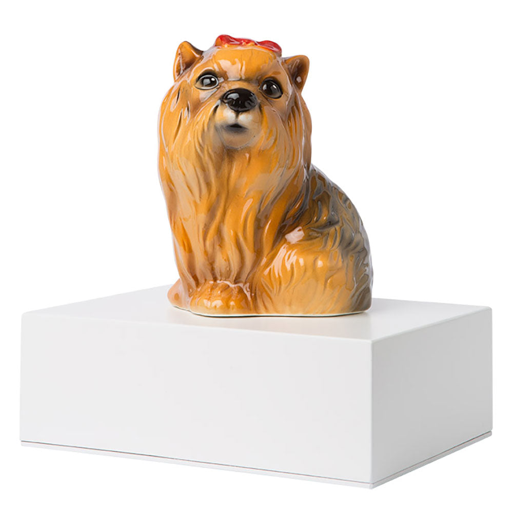 Urne cinéraire en bois laqué blanc. Mesures du produit : largeur 20 cm profondeur 15 cm et hauteur 10 cm. La capacité volumétrique de ce produit est d'environ 2,5 L, c'est-à-dire adapté aux animaux de plus de 40 kg. La miniature en céramique d'un Yorkshire Terrier mesure environ 15 cm et est peinte à la main. Fermeture avec des vis.