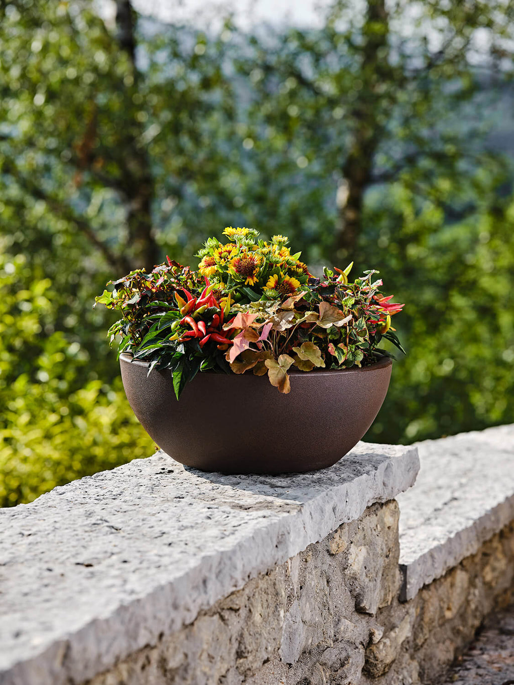 Le vase bol Era est une jardinière également disponible en grandes dimensions en forme de bol en résine plastique renforcée et est produit avec une technologie de rotation (rotomoulage) qui garantit une résistance et une solidité élevées permettant la création de produits légers même dans les plus grandes dimensions. La finition striée, mate et satinée est disponible en plusieurs couleurs, se lave facilement sans détergent, résiste aux chocs et est 100% non toxique et recyclable. Il dispose d'une zone préaménagée pour un trou qui permet à la fois le drainage de l'excès d'eau et la possibilité de créer facilement une réserve d'eau pratique. Ce vase peut être utilisé sans problème à l'extérieur, en milieu urbain ou comme vase de terrasse ou de jardin car il est résistant aux rayons UV et donc inaltérable en couleur. Le vase résiste sans problème à la chaleur et au froid de -30°C à +60°C. Produit fabriqué en Italie .