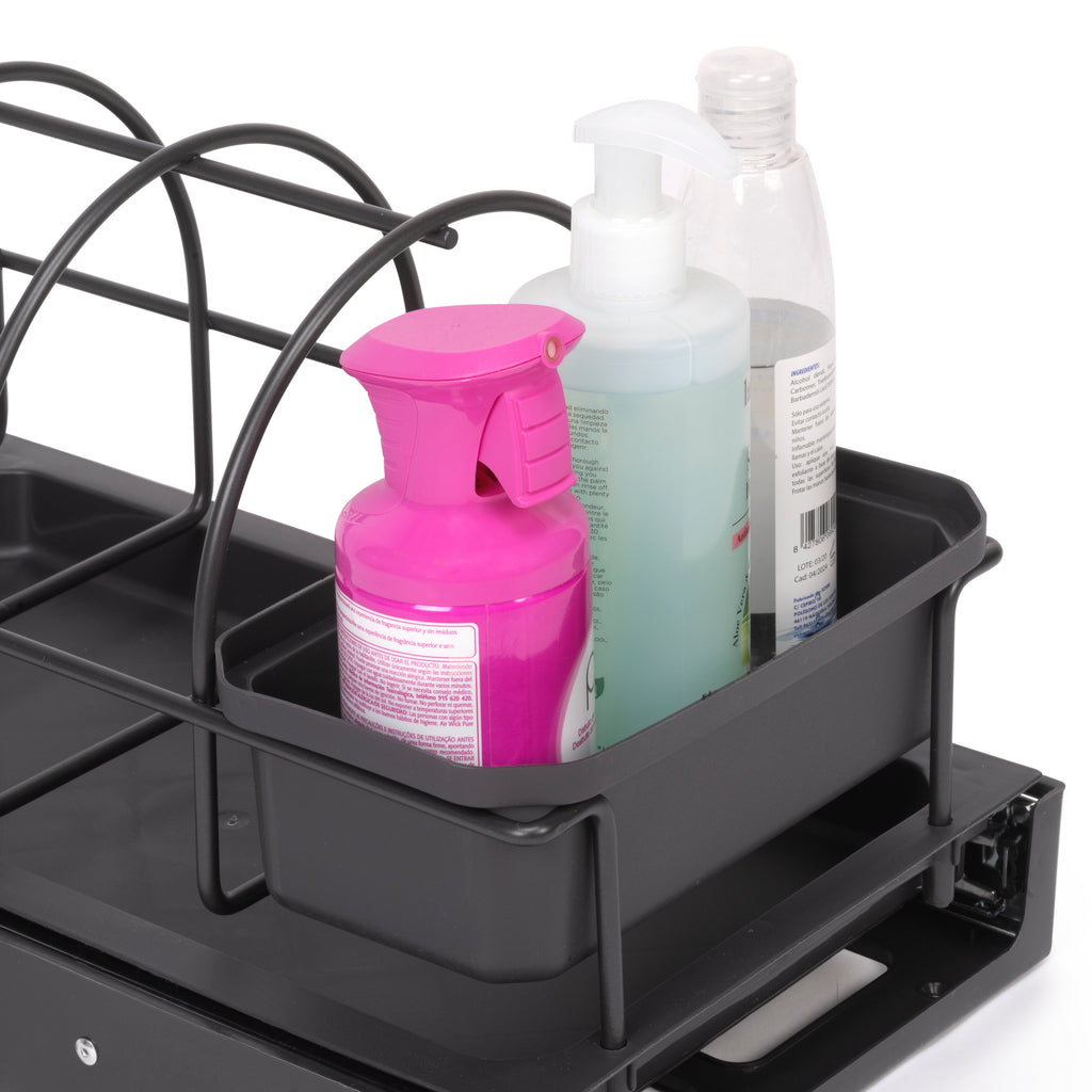 Le bac à accessoires de cuisine est conçu pour ranger les produits d'entretien dans le meuble sous l'évier. Sa structure est équipée de guides à billes entièrement extractibles pour un accès facile aux détergents, manuellement ou automatiquement s'il est fixé à la porte.