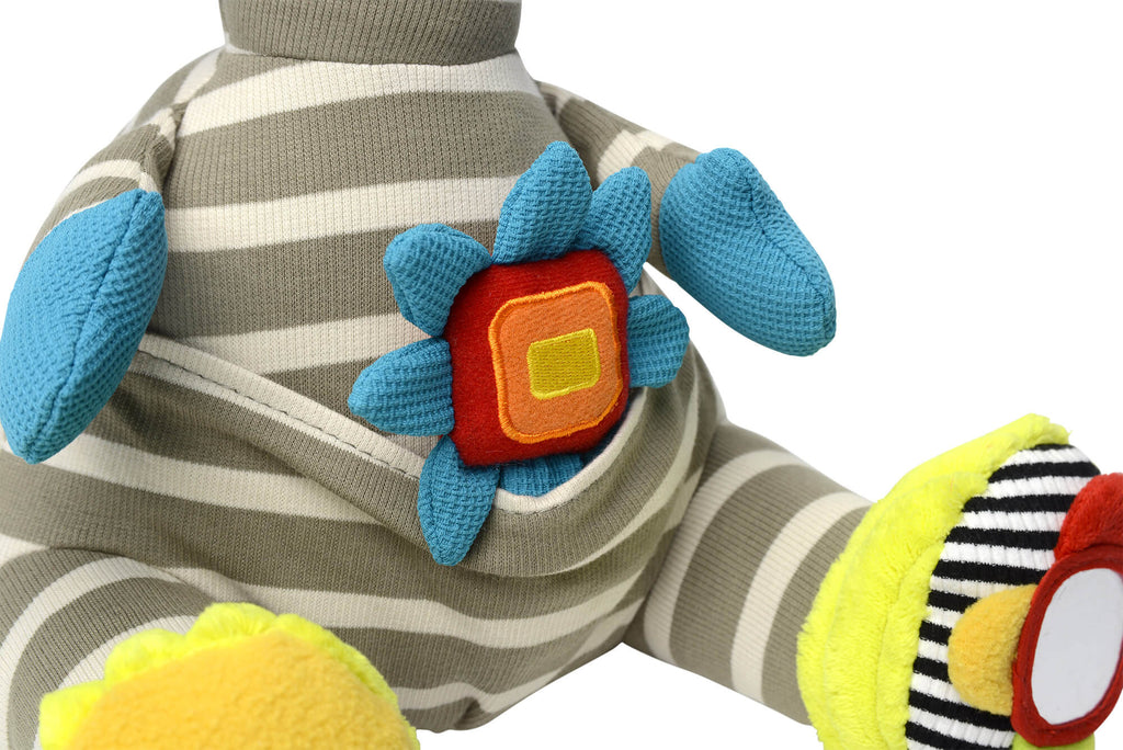 Ce grand Zèbre multi-activités contient de nombreux jeux pour un enfant qui apprend en jouant. Le corps est fait d'un joli tissu tricoté, comporte des miroirs, des hochets, une fleur amovible qui sonne lorsqu'on la presse et des anneaux de dentition sur la queue et les oreilles. Parfait pour enseigner la motricité fine dans les petits et grands mouvements, ainsi que l'exploration sensorielle.